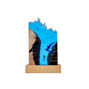 DiscoverSharks (OFFICIAL) Luz noturna de tubarão - Lâmpada oceânica de resina reciclada para escritório, mesa, banheiro ou quarto - luz noturna encantadora de tubarão e oceano! - Artesanato de alta qualidade: Feito de resina epóxi de alta qualidade, esta lâmpada noturna tem elementos claros que criam um efeito 3D deslumbrante. A luz LED embutida na base destaca as figuras de mergulho e tubarões, adicionando um brilho mágico ao seu espaço. - Materiais reciclados: a arte de resina epóxi transforma objetos do dia a dia em incríveis obras-primas, dando nova vida a velhos tesouros como árvores, pedras, conchas e flores. Inspira criatividade e estimula a reciclagem ecológica de itens envelhecidos em uma bela decoração. - Oito cores: mergulhe em um mundo subaquático hipnotizante com nossa luz noturna lindamente projetada. A base de madeira esconde luzes LED removíveis que iluminam suavemente os detalhes, transformando-a em uma exibição noturna cativante. - Presente atemporal: o design atemporal desta luz noturna a torna perfeita para qualquer ocasião, como Natal, Halloween, Ano Novo, Dia dos Namorados, aniversários e formaturas. - Multiuso: esta lâmpada noturna epóxi é uma ótima adição para qualquer cômodo. Você pode usá-lo em sua sala de estar, quarto ou quarto de criança como uma decoração elegante para o seu espaço, prateleira, estante ou mesa.