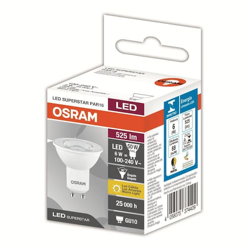 Lampada led par16 ho 6w 2700k 525lm biv gu10-osram Lampada ledvance led par16 ho 6w 2700k 525lm biv gu10 Características e benefícios: Retrofit de lâmpadas halógenas dicróicas. Design elegante Temperaturas de cor: 2700k Versões: tradicional, dimerizável, alto fluxo e irc90 Baixa geração de calor: não aquece o ambiente. Até 90% de economia no consumo de energia e vida útil 25x maior Garantia de 3 anos