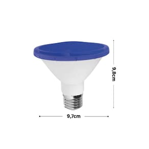 Lâmpada Par30 Led 10W Bivolt Luz Azul, IP65 E27 Luminatti. Seu acabamento refletor enfatiza o brilho da luz, o distribuindo de forma suave e uniforme. Ideais tanto para ambientes internos como externos, já que as lâmpadas estão protegidas de jatos de água e poeira, com Índice de Proteção 65 (IP 65).
