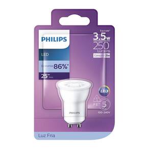 Lâmpada Led Philips Mini dicróica MR11 3.5W bivolt base GU10 (escolher cor da luz no momento da compra)Garantia: 5 anosCaracterísticas da lâmpada:- Formato -MR11- Base/encaixe - GU10- Não dimerizável- Voltagem - Bivolt 100 - 240 V- Potência em watts - 3.5W- Equivalente em Watts - 25WCaracterísticas da luz:- Emissão de luz - 250 lumens- Índice de reprodução de cor (CRI) - 80- Vida útil: 25.000 horas A Essential LEDspots, compatíveis com a maioria das instalações existentes com a base GU10, foram desenvolvidas para substituição dos refletores halógenos. Eles permitem uma economia significativa de energia e minimizam o investimento inicial.BenefíciosAté 90% de economia de energia em comparação com lâmpadas halógenas tradicionaisCustos de manutenção menoresBaixo investimento inicialCaracterísticasFácil retrofitVida útil de até 15.000 horasNão dimerizávelIluminação sem ultravioleta e infravermelhoAplicaçõesAplicações residenciais