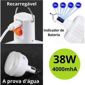 A lampada LED bulbo com luz de emergencia e uma opcao pratica e conveniente para iluminar ambientes com qualidade e ainda contar com uma funcao de luz de emergencia para situacoes inesperadas. Com uma potencia de 38W e uma bateria de 4000mAh, ela e capaz de iluminar por ate 4 horas seguidas em modo de emergencia, alem de ter um tempo de carga rapido de apenas 3 horas. Com uma conexao USB para recarga, e possivel carrega-la em qualquer lugar e te-la sempre a mao para qualquer eventualidade. Alem disso, a lampada LED bulbo oferece uma luz de qualidade, com temperatura de cor branca, ideal para iluminar ambientes residenciais ou comerciais. Marca: Não Informado Ean: 6939020452190