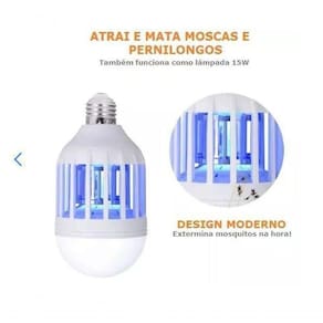 Lâmpada de led 2 em 1: ilumina com led branco 15w e possui leds uv para atrair e eliminar pequenos insetos voadores (ex: pernilongos), quando entram na câmara da lâmpada , são eliminados com pequeno choque elétrico.