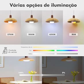 Modelo: WKD-B10W Potência: 15W Tensão: Bivolt (100-240V) Fluxo Luminoso: 810 lúmens Temperatura de Cor: 2700K~6500K RGB Dimensões: 130mmX80mm Peso: 61.6g O aplicativo Avant coibeu funciona na rede 2.4GHz , portanto é importante conectar o celular a essa rede antes de configurar o dispositivo.