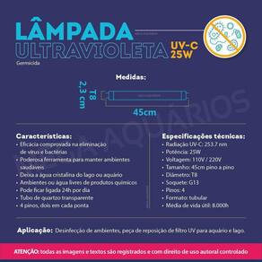 Lâmpada UV tubular fluorescente T8 germicida UV-C 25W para esterilização de ambientes, água e reposição filtro UVLeia atentamente o anúncio antes da compra.Nossa lâmpada tubular germicida UV foi desenvolvida com tecnologia de ponta para garantir a mais alta qualidade e eficiência em desinfecção, é a escolha ideal para garantir um ambiente livre de germes e uma água cristalina para seu aquário ou lago.Principais Características:Eficácia comprovada na eliminação de bactérias, vírus e outros micro-organismos nocivosA lâmpada UV-C germicida é uma poderosa ferramenta para manter ambientes saudáveisDeixa a água cristalina do lago ou aquário Livre de produtos químicos, a luz UV-C não deixa resíduos tóxicos no ambiente, no ar ou na água tratadaPode ficar ligada 24h por diaTubular / linearTubo de quartzo transparente4 pinos, dois em cada pontaNecessita de reator próprio para lâmpada UVNecessita de equipamento próprio para desinfecção de ambientes ou um filtro UV para esterilização de águaNunca manuseie a lâmpada com ela ligada, não exponha olhos e pele à radiação da lâmpada. Aplicação - Para que serve a lâmpada ultravioleta - UV-C germicida:Peça de reposição para filtro ultravioleta UV de lago ou aquárioManter a água do aquário ou lago cristalina e livre de micro-organismos que possam prejudicar a saúde dos peixes e plantasTratamento de água e esgotoDesinfecção de ambientes como hospitais, farmácias, restaurantes, academias, transporte público, indústrias alimentícias e outros locais que necessitam manter o ambiente seguro e livre de patógenos.Especificações técnicas:Marca: Mega AquáriosModelo: Lâmpada UV UV-C germicida fluorescente ultravioleta 25WRadiação: Emite radiação UV de onda com um pico de 253.7 nm UV-C Potência: 25WVoltagem: 110V / 220V pode ser ligada nas duas voltagens conforme ligação do reatorTamanho: 45cm pino a pinoDiâmetro: T8Soquete: G13Pinos: 4Formato: tubularMédia de vida útil: 8.000hPeso: 65g.Necessita reator específico para lâmpada fluorescente de 25W.A lâmpada germicida também pode ser conhecida como:Lâmpada UV-C, lâmpada germicida, GL, lâmpada esterilizadora, luz ultravioleta C, luz uv.Como usar a lâmpada UV ultravioleta para esterilizar água: É necessário a utilização de um esterilizador ou filtro UV, nunca coloque a lâmpada ultravioleta UV-C diretamente na água sem um equipamento próprio. A utilização de materiais para vedação como: silicone, Durepox e outros materiais semelhantes não garantem a vedação correta, podendo passar água para os pinos e consequentemente a queima da lâmpada, caracterizando uso indevido e a perda da garantia. Utilize sempre material apropriado como anéis de vedação de borracha.Como descartar a lâmpada UV corretamente:Procure pontos apropriados de coletas específicos para materiais reciclados como lâmpadas e resíduos eletrônicos.Nunca jogue lâmpadas tubulares no lixo comum, pois elas contêm metais pesados e outros materiais perigosos.IMPORTANTEJamais exponha os olhos ou a pele à radiação emitida pela lâmpada UV ultravioleta, sob risco de danos gravíssimos irreversíveis aos olhos além de queimaduras na pele. A utilização de equipamentos de segurança é obrigatória.Obrigado pela visita e boas comprasATENÇÃONossas imagens e textos são registrados e com direito de uso autoral controlado e reservado a essa loja e as lojas parceiras devidamente autorizadas em contrato.
