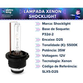 • Marca: Shocklight • Base de Soquete: P32d-2 • Encaixe: D2S • Tonalidade (K): 5500K • Potência: 35W • Voltagem: 12V • Tecnologia: Xenon • Luz de Alta Intensidade • Proporciona Maior Economia e Qualidade • Código de Referência: SLX5-D2S