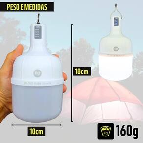 Lâmpada led 38w recarregável bateria 4.000mah Especificações: Potência: 38w Entrada de carga: 5v=== 1a Bateria de lítio: 18650 3,7 v 4000 mah Tempo de carga: = 5 horas Duração da bateria: - 3,5h modo super brilhante - 4,5h modo brilhante - 12h modo brilho baixo - material: pp e componentes eletrônicos Peso: 160g Medidas: - altura: 18cm - largura: 10cm Cuidados e conservação: - tempo de carregamento não deve ultrapassar 24h; - não olhar diretamente para os leds, pois é prejudicial à visão; - manter longe de produtos inflamáveis durante o carregamento da bateria; - não deixar a bateria por mais de 3 meses sem carregar para preservar sua vida útil; - quando em uso, se a última luz do visor de energia estiver acesa, indica que a bateria está próxima do estado de uso de baixa tensão, neste momento, para proteger a bateria, o uso deve ser interrompido e a bateria deve ser recarregada. Qualquer dúvida, utilize o campo de perguntas que responderemos imediatamente. do vendedor: 30 dias