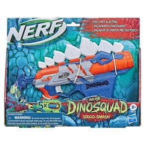 A aventura ganha novas emoções com estes lançadores da equipa de elite DinoSquad! Os mais poderosos dinossauros inspiram o design destes lançadores, trazendo grande ação à aventura! A ação torna-se jurássica com o lança dardos Nerf DinoSquad Stego-smash, que apresenta um impressionante dino design de estegossauro! O lançador é de carga frontal: basta inserir 1 dardo no tubo frontal, preparar e lançar. O porta-dardos para 4 dardos no apoio mantém os dardos ao alcance para recarregar e continuar a brincar.