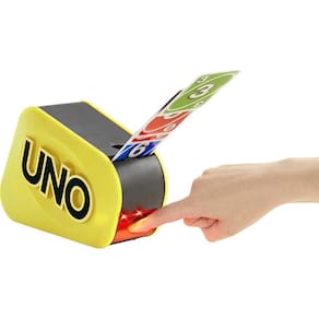 Esta edição do jogo UNO Attack Mega Hit, apresenta um lançador de cartas com um design elegante que dispara cartas no ar! Luzes frias e efeitos sonoros piscam mais rápido cada vez que o botão é pressionado, adicionando ao suspense. A expectativa esperando para ver quando as cartas vão disparar é quase insuportável! Empilhe as cartas na máquina e jogue a cor favorita de todos e o jogo de correspondência de números. Se o cartão de ataque aparecer, cuidado! Quando os jogadores têm apenas uma carta sobrando, eles ainda devem gritar "UNO!" Cores e decorações podem variar.