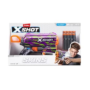 Vá direto para a batalha com a capacidade de dardo único do lançador X-Shot Skins Flux e armazenamento frontal de 2 dardos. O Flux eliminará seus inimigos e pode atingir alvos a até 27m de distância. O X-Shot Skins Flux vem em 6 skins com estampas exclusivas e de alta qualidade para selecionar e colecionar e vem com 8 dardos de espuma. A brincadeira será muito mais divertida com o X-Shot Flux Skins!