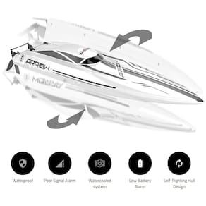 Motor refrigerado a água sem escova acionado por um potente motor refrigerado a água sem escova 3554A, com sistema automático de refrigeração a água, para estender a vida útil do modelo do navio. 2.4 GHz de alta velocidade 2.4 GHz sistema de controle de rádio marinho suporta vários barcos rc para correr em sincronia A velocidade máxima de até 30 MPH 50km , h permite que você tire outros barcos de controle remoto da água Brinquedos de navio de corrida rc ideais para piscina e ao ar livre Recurso de recuperação de emborcamento o design do casco com endireitamento automático faz com que o barco de corrida volte ao jogo rapidamente, enquanto o barco está virando. Alarme de Sinal Fraco O transmissor do barco rc emitirá um som de alarme para você fazer uma viagem de retorno ou parar o barco a tempo enquanto o sinal fica ruim. Tampa de travamento duplo projetada Projetada com tampas duplas para evitar a infiltração de água durante o jogo e danificar o barco