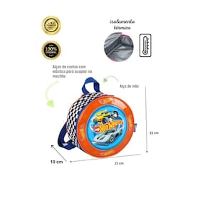 Lancheira Escolar Térmica Hot Wheels Produzido em poliéster Possui alças de costas Material interno térmico Ziperes com puxadores personalizados Estampa estilizada Não acompanha potinho e garrafinha Dimensões: 22 x 20 x 8cm alt x larg x prof ;