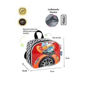 Lancheira Escolar Térmica Hot Wheels Produzido em poliéster Possui alças de costas Material interno térmico Ziperes com puxadores personalizados Estampa estilizada Não acompanha potinho e garrafinha Dimensões: 22 x 20 x 8cm alt x larg x prof ;