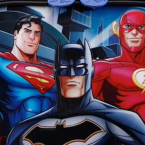 Lancheira escolar Liga da Justiça com frente em PVC, puxadores em metal, alça de mão em nylon, alça de costas ajustáveis e etiquetas personalizadas.