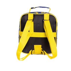 Ela conta com frente estampada em PVC vincado, fechamento em zíper com puxadores personalizados, alça de mão em nylon reforçado com poliéster e alças de costas ajustáveis. Além disso, possui alças para encaixe nas hastes das mochilas de rodinhas, garantindo maior facilidade no transporte.