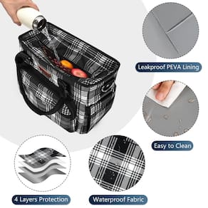 Esta lancheira grande pode acomodar 2 lancheiras, 2 frutas, 4 bebidas, 2 copos de água e seus utensílios de mesa. Esta lancheira com isolamento térmico é projetada com isolamento triplo para manter os alimentos frios/quentes/frescos por horas. Possui forro de EVA extragrosso para facilitar a limpeza. O tecido impermeável de nylon premium desta lancheira reutilizável é resistente à sujeira e à abrasão, protegendo seu almoço e seu conteúdo de respingos ocasionais ou chuva leve.