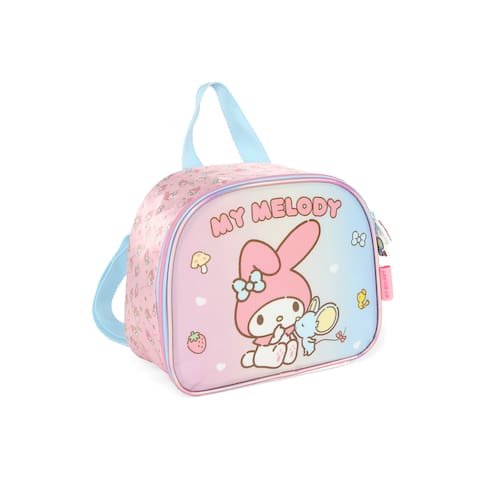 Produzida pela Luxcel, com materiais de alta qualidade e resistentes; Estampa oficial da My Melody, com acabamento brilhante; Alça de mão e alça de costas ajustável para maior praticidade; Espaço interno térmico que ajuda a conservar os alimentos frescos por mais tempo; Fechamento em zíper com puxadores personalizados; Fácil de limpar e super leve para carregar no dia a dia.