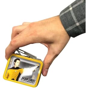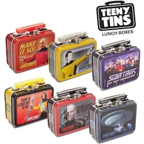 Ótimas para colecionadores, estas pequenas latas apresentam imagens fantásticas da série Star Trek: The Next Generation! Cada lata de aproximadamente 7,6 cm de largura x 5 cm de comprimento foi impressa em tela colorida para apresentar alguns dos seus personagens favoritos da série Star Trek: The Next Generation. Cada lata pequena vem completa com alça de plástico dobrável para transporte, além de dobradiça e trava para facilitar a abertura. Inclui uma (1) lancheira Teeny Tin aleatória. Há seis (6) designs no total para colecionar.