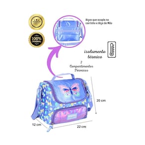 Lancheira Térmica: Confeccionada em Poliéster Isolamento térmico Alça de mão Alça que prende na mochila de rodinhas Design exclusivo Puxadores personalizados Fechamento em zíper Medidas aproximadas: Altura: 20 cm Largura: 12 cm Comprimento: 22 cm