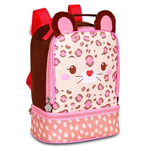- designer personalizado onça. - com orelhinhas. - possui 2 compartimentos. - 1 alça de punho. - 100% poliéster. - alça traseira para acoplar a mochila. - 1 alça de punho. - com revestimento interno térmico para conservar bebidas e lanches por muito mais tempo.