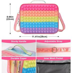 Lancheira Termica Pop It Arco-Iris com alça Ajustavel Transversal e alça de mão A cor do arco-íris da lancheira combina brinquedo pop it , lancheira moderna para crianças, mas também um brinquedo para aliviar o tensão, você pode se divertir pressionando as bolhas após a refeição. Tem melhor espaço de uso para garrafa de água, frutas e lanches. Projetado com um compartimento principal para manter seus alimentos e bebidas quentes ou frescos. O bolso frontal perfeito para chaves, guardanapos, carteira e bolso de malha para facas e garfos. Ótimo para crianças e adultos utilizados como bolsa térmica, lancheira, bolsa de piquenique e fácil de transportar com alça removível e ajustável. E feita de polietileno expandido de 4 mm de espessura, acolchoada e com forro Pode manter alimentos ou bebidas quentes/frescas por até 4-8 horas Brinquedo para aliviar o tensão Através da pressão na grande lancheira, as bolhas macias para baixo, proporcionam uma excelente experiência tátil, aliviam efetivamente a ansiedade e o e eliminam a irritabilidade. As crianças vão se divertir pressionando jogos de bolhas, mais diversão e menos pressão. Medidas Comprimento: 30 cm Largura: 25 cm Profundidade: 5 cm