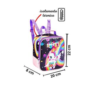 Lancheiratérmica UnicórnioProduzido em poliésterPossui alças de costasMaterial interno térmicoZiperes com puxadores personalizadosEstampa estilizadaNão acompanha potinho e garrafinhaDimensões: 22 x 20 x 8cm alt x larg x prof ;