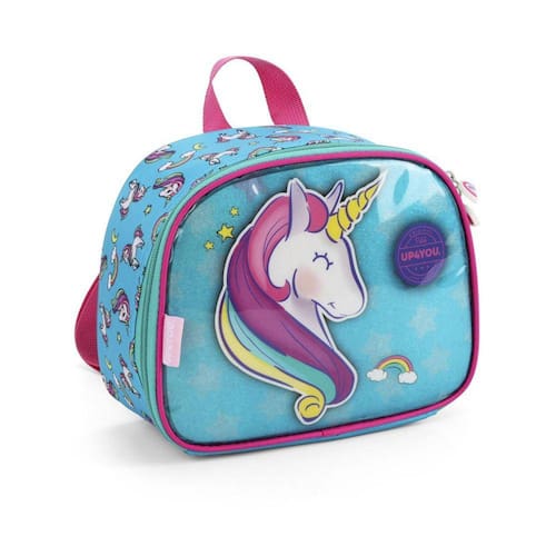 Lancheira Bolsa Térmica Unicórnio Basic - Produzida em poliéster; - Possui 1 bolso lateral 1 frontal e 1 divisão grande; - Forro interno em pvc; - Estampa estilizada; - Zíperes com puxadores reforçados; - Alça transversal removível; - Alça para mão; - Não Acompanha garrafinha e porta lanche ;