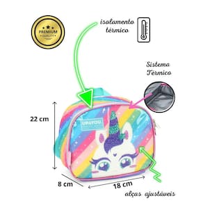 Lancheira Bolsa Térmica Unicórnio Basic - Produzida em poliéster; - Possui 1 bolso lateral 1 frontal e 1 divisão grande; - Forro interno em pvc; - Estampa estilizada; - Zíperes com puxadores reforçados; - Alça transversal removível; - Alça para mão; - Não Acompanha garrafinha e porta lanche ;