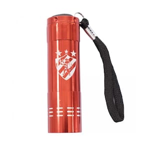 Superjogo contendo uma lanterna com 9 lâmpadas na cor branca e um chaveiro de metal equipado com cortador de unha e abridor de garrafas, tudo isso customizado com as cores e com o brasão do seu time de coração.