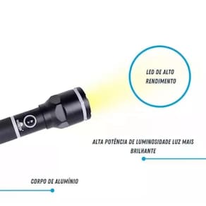 - Corpo em alumínio; - Alta potência de luminosidade; - Lentes resistentes ao impacto; - Resistente à água (não é à prova dágua); - Vida útil do CREE LED: 100.000 horas; - Utiliza 2 Pilhas tamanho D - Grande (Não Inclusas); - Diâmetro maior 60mm (lente); - Diâmetro menor 40mm (cabo); - Comprimento 27cm.