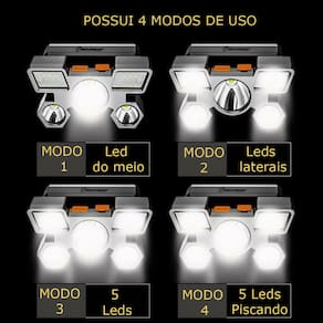 Lanterna De Cabeça Gold Sports Holofote Recarregável 4 Modelos de iluminação Bateria de Lítio A Prova de Água e ideal para vários esportes e atividades. A lanternas de cabeça é leve e ajustável até 90° e suas tiras elásticas a mantém firme É muito fácil de ser colocada e ajustada na sua cabeça, possui 5 desenho de leds diferentes e 4 modos de iluminação. A sua iluminação é de alto alcançe e seus leds são de cor branca Bateria longa duração - Alcance: 350-1000m Luz principal: 15-20h Lúmens: 100 lúmens (cada luz led) Prova d água :Sim (não submergível) Método de carregamento: Carregamento USB Android, Tomada de computador, banco de energia, tomada doméstica Durabilidade do tempo em uso: 2-6 horas tempo de carregamento da bateria interna: 2-4 horas Função: 1 luz acesa-4 luzes acesas-5 luzes acesas-5 luzes piscando Materiais: ABS, PC Poliester Carregamento interface: através de um cabo USB Bateria: bateria de lítio 1 Acessórios:01 micro Micro USB cabo e uma tira elástica ajustável de cabeça Marca:Gold Sports Garantia: 01 mês somente contra defeito de fabricação