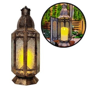Lanterna Decorativa Iluminada Hexagonal em Metal e Vidro – Bronze Rústico com Vela LED Inclusa – 45cm x 15cm