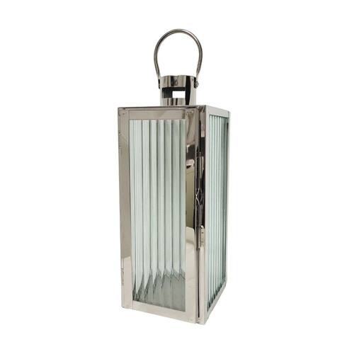 Com grande porte (38cm de altura x 13cm de largura x 27cm de profundidade), a lanterna se destaca pela estrutura robusta em aço inox brilhante e pelos vidros canelados em todas as laterais, que adicionam textura e sofisticação ao jogo de luz e sombra. A peça conta com porta com dobradiças e pino metálico de fechamento, além de argola superior, que permite usá-la tanto apoiada quanto pendurada.