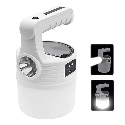 Características: Material: abs Cor das luzes: branco frio Alimentação: solar e usb Capacidade da bateria: 1200mah Potência da lanterna: 5w Potência do corpo: 10w Alcance máximo: 50m Led indicadores de bateria. 10 modos 5 modos como lanterna e 5 modos como luminária Gancho embutido Led potente Resistente a água Portátil