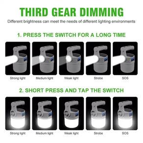 Esta luminária possui um carregamento solar e usb, é perfeita para te ajudar em acampamentos ou até mesmo em caso de faltar luz, caminhadas e tarefas noturna. Seus leds são potentes além de duplos, acende como uma lanterna e também possui led no corpo da luminaria que acende. As luzes variam de acordo com o que deseja, além das luzes s.O.S. Além disso, esta luminária possui ganchos que podem ser pendurados onde quiser/precisar.