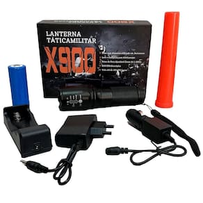 ESPECIFICAÇÕES: - Modelo: X900 - Cor da Luz: Branca - Material: Alta resistência em liga de magnésio, usinagem , dura e resistente não se deforma - Feita de alumínio classe A leve e compacta - Feixe de foco ajustável com zoom de 1-2000x - Modos de funcionamento: 100% da capacidade Super Potente 50% da capacidade Econômica Strobo pisca pisca SOS Universal - Zoom: Novo Sistema de Foco regulável 1 - 2000x - Fonte de luz: Utiliza LED vida útil até 100.000h - Alimentação: 1 bateria Li-ion 26650 de 1.200mah - 4.2V Recarregável - Tempo de Recarga: Aproximadamente 6h carga completa - Autonomia de Uso: Aproximadamente 1h de uso contínuo modo mais forte Até 12h nos demais modos de iluminação de uso contínuo - Raio de Luz com 800 lumens de potência - Raio Telescópio Ajustável CUIDADOS E INDICAÇÕES: - Não olhe diretamente para a luz - Não mexer com a cabeça de tocha ou separado o refletor e o bulbo - Limpe a lanterna com tecido macio após o uso - Lubrificante de silicone pode ser aplicado a interface - Remova a bateria caso não esteja em uso por um longo período e mantenha em local seco - Evite luz solar direta Para usar a caixa de bateria, basta colocar na bateria e aperte o alto parafusos coverwith. Quando a tomada é ligada a cor vermelha indica que o carregamento está em progresso, quando a luz ficar verde indica que a bateria está completamente carregada. Lanterna muito Utilizado para seguranças, pesca, camping, runnig, sitio e etc. DIMENSÕES: Alutura: 14cm Largura: 3,5cm Profundidade: 3,5cm Medidas aproximadas ITENS INCLUSOS: - Lanterna de Led recarregável - Bateria 26650 - Adaptador para usar com pilhas comum - Carregador Bivolt - Carregador para carro - Sinalizador para rosquear na lanterna Marca: Não Informado Ean: 7895309963377