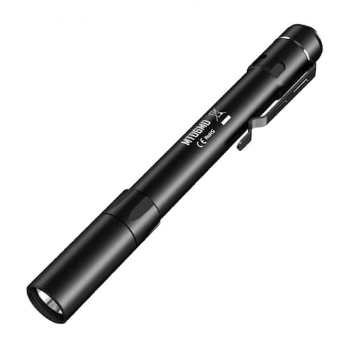 Lanterna Nitecore MT06MD com: 180; 45; 4 lumens, autonomia de: 45min; 5h15; 35h. Dimensões de: 128 x 14 mm, 22 gramas. Forma de acionamento: Botão traseiro. Utiliza: 2*AAA, podendo utilizar baterias recarregáveis Ni-MH(não inclusa), Alcance de:. Acompanha: Clip. IPX8 - até 2 metros. Contém as seguintes funções características: Liga sempre no fraco, pode ser esterelizada com álcool. Resistência a quedas: 1,5 metros. Possui: 860 candelas. Validade não aplicável.