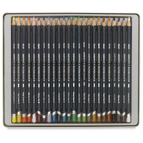 - Estojo de metal que contém lápis profissionais para aquarela da linha Watercolour, da Derwent