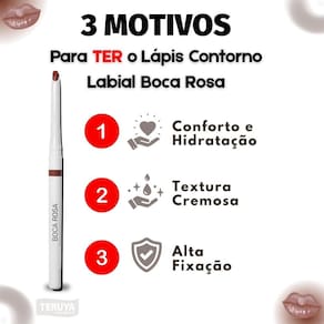 Realce a beleza dos seus lábios com o Lápis Contorno Labial Boca Rosa Chocolate Intenso. Desenvolvido para proporcionar lábios definidos e uma cor intensa desde o primeiro traço, este lápis é a ferramenta ideal para um acabamento impecável. Sua textura cremosa desliza suavemente, facilitando o contorno e o preenchimento, enquanto a fórmula enriquecida com óleos vegetais de origem natural, como o Óleo de Semente de Algodão e o Óleo de Rícino, garante hidratação e conforto.