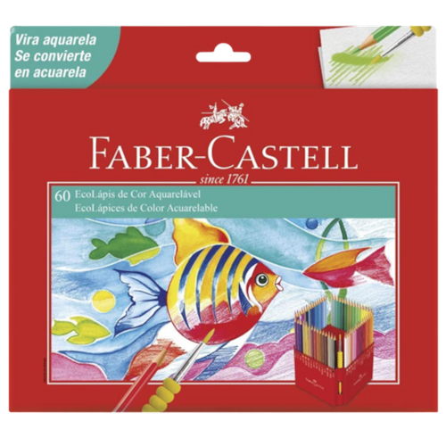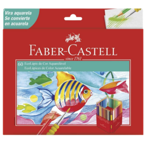 Detalhes do produto Deixe a criatividade fluir com os Ecolápis de Cor Aquarelável da Faber-Castell Seus desenhos mais vivos e realistas com 60 cores vibrantes com perfeita cobertura Com o uso do Pincel Soft Touch, seu desenho vira aquarelável! O formato do Ecolápis é sextavado e sua fórmula é exclusiva, utilizando o processo especial de fabricação TS - Técnica Sekural, que proporciona maior resistência à ponta do seu Ecolápis Este kit contém: 60 Ecolápis Aquareláveis + estojo exclusivo + Pincel Soft Touch ATENÇÃO: Não mergulhe os Ecolápis Aquareláveis na água Madeira 100% proveniente de manejo florestal sustentável e certificado Produto atóxico e não perecível