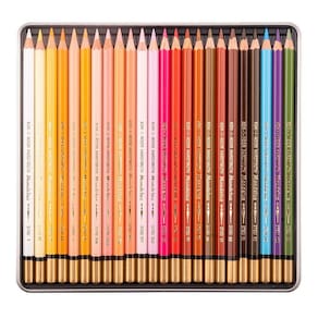 Conjunto de 24 lápis de cor Aquarela - Retrato em uma caixa de lata elegante. Esses lápis hexagonais possuem um núcleo altamente pigmentado, garantindo cores vivas e intensas. Com um acabamento premium, a parte superior dos lápis é marcada em dourado, eles exalam qualidade e sofisticação.