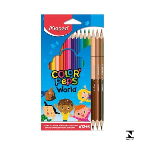 Caixa de papelão com 12 lápis de madeira de cor e 3 lápis de cor da pele duo. A paleta ideal para representar todas as faces do mundo e sua diversidade! Lápis de cor Maped têm uma grafite durável e são fáceis de apontar para uso diário confortável e fácil. Eles têm uma forma triangular específica que facilita a aderência para recursos mais seguros. Lápis Maped estão em conformidade com os regulamentos de brinquedos para uso seguro. Cores vivas e intensas, em qualquer lugar, a qualquer hora, graças aos lápis da linha Color'Peps!