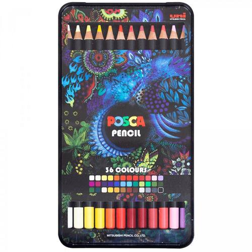 Nova linha de Lápis de cor Posca. Conjunto de trê estojos com 12 cores sobrepostos, totalizando 36 cores, brilhantes e facies de mesclar.