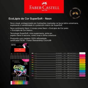 Visual protagonizado por ilustrações inspiradas na fauna latinoamericana, explorando a versatilidade e a criatividade artística. Com mina super macia, cores mais vivas e excelente cobertura, pinta papéis claros e escuros. Selo de originalidade mostrando o pioneirismo e design exclusivo Faber-Castell. Produzido com madeira 100% reflorestada, certificada FSC - Forest Stewardship Council.