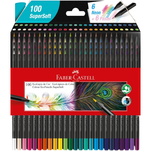Detalhes do produto EcoLápis de Cor Faber-Castell SuperSoft possui a exclusiva mina supermacia, que garante o máximo de conforto ao pintar Esse kit contém 100 cores mais vivas com excelente cobertura, sobre papéis claros e escuros Além disso, a embalagem é reutilizável e 100% reciclável