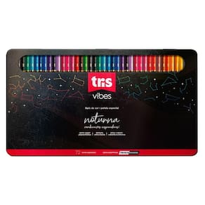 A linha Lápis de Cor Noturna Vibes da Tris é perfeita para quem quer explorar novas combinações de cores e se aprofundar no mundo das artes. Com cores super pigmentadas, uma paleta especial com 72 cores, mina de 4.0mm garantindo traços consistentes. Textura ultra macia e cobertura intensa, esses lápis possuem design moderno com corpo redondo e estampas holográficas.