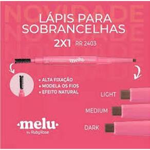 Lápis De Sobrancelha 2X1 Melu - Ruby Rose Cor: Medium Lápis de Sobrancelha 2x1 escovinha Melu by Ruby Rose Modo de usar: Deslize pela sobrancelha com a ponta chanfrada para preencher e modelar, passe a quantidade deseja para construir a cor. Com o outro lado esfume e penteie com a escovinha.