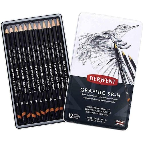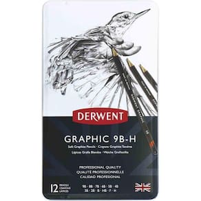Um bom desenho em grafite começa com um bom lápis de grafite com a linha derwent graphic, você tem uma ampla graduação de opções, da maciez do 9b até o 9h (duro).Temos os lápis certos para quem gosta de ilustrações detalhadas finas, repletas de sombreamentos e texturas você não esperaria nada menos da empresa que criou os primeiros lápis de grafite no reino unido: a alta qualidade é notável pois os lápis são feitos a partir dos melhores materiais. O estojo de lata com 12 lápis graduados de baixa dureza contém as versões 9b, 8b, 7b, 6b, 5b, 4b, 3b, 2b, b, hb, f e h.