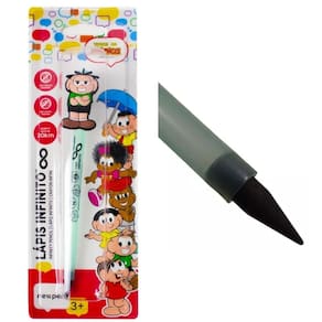 O lápis infinito da newpen turma da mônica equivale a 100 lápis comuns e possui uma tecnologia que consegue comprimir 100 grafites em nano partículas de grafeno, que é um material mais resistente que o grafite natural.