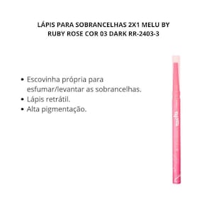 Lápis Para Sobrancelhas 2X1 Melu By Ruby Rose Cor 03 Dark Rr-2403-3 Modo de usar: Deslize pela sua sobrancelha com a ponta chanfrada para preencher e modelar, passe a quantidade desejada para construir a cor. Com o outro lado esfume e penteie com a escovinha.