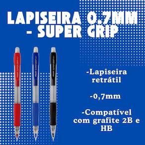 A Lapiseira Super Grip 0.7 destaca-se por seu corpo translúcido arredondado e um grip em borracha macia, proporcionando uma experiência de escrita confortável e precisa. Sua anatomia foi cuidadosamente projetada para oferecer maior conforto durante o uso.